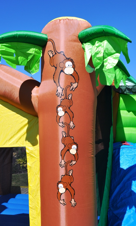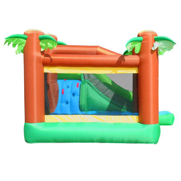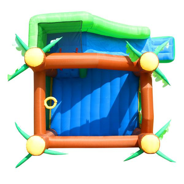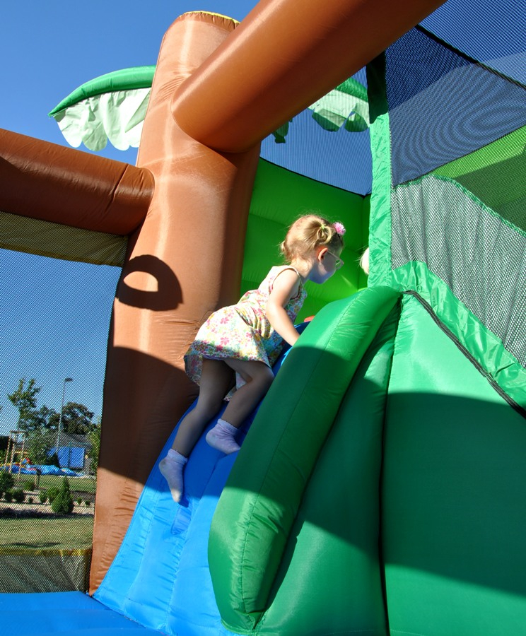 Do skákacího hradu se skluzavkou je čelní vstup. Všechny stěny i horní část skluzavky je zajištěna ochranou sítí. Pro zábavu dětí je k dispozici také skákací plocha doplněná o basketbalový koš.