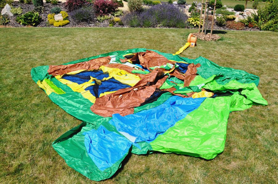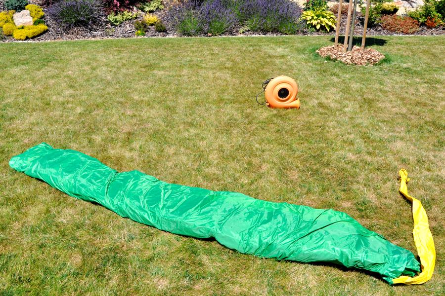 Příprava skákací atrakce Happy Hop je rychlá a jednoduchá. Na žlutý rukáv se připojí fukar suchým zipem a po zapnutí do elektřiny je atrakce nafouknuta a připravena pro děti asi za jednu minutu.