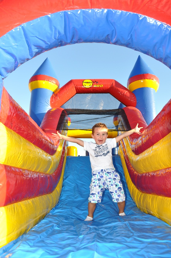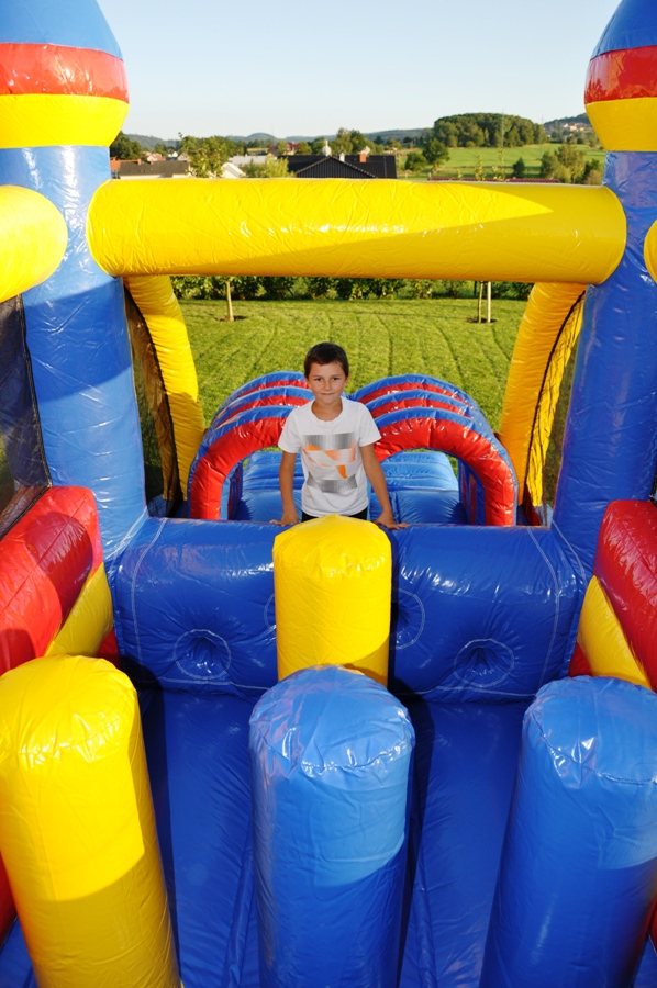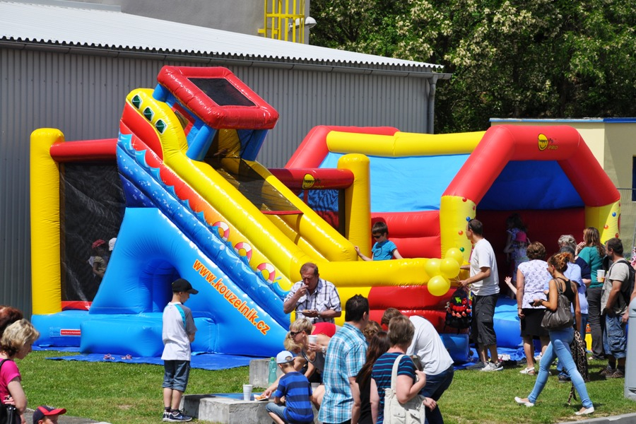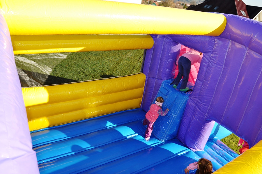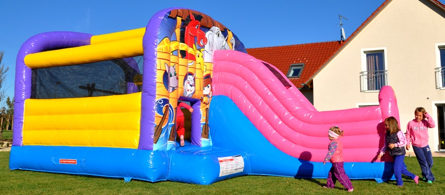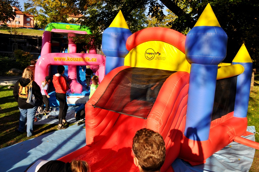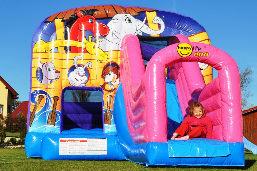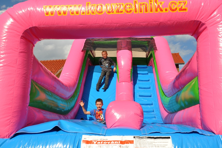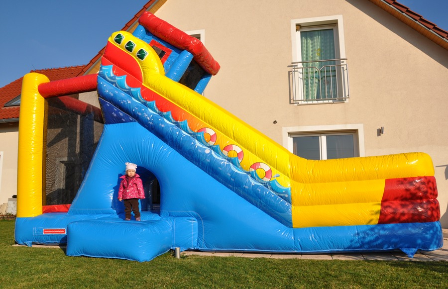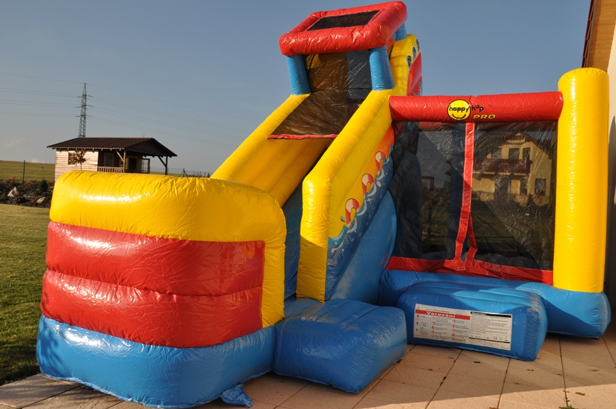 Tato atrakce je kombinací skákací plochy a skluzavky. Děti mohou atrakcí probíhat.