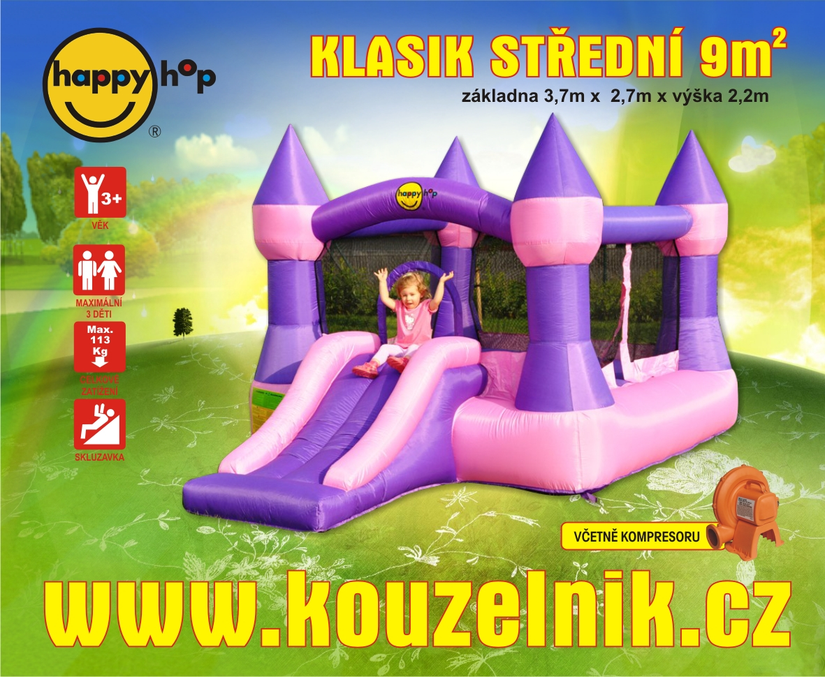 Oblíbený model za skvělou cenu. Do skákacího hradu je vstup z pravé strany a ven se děti sklouznou po skluzavce. Mohou si nejen zaskákat, ale aktivně si užít probíhání a kluzání na skvělé nafukovací atrakci značky Happy Hop. Klasik střední nabízí velkou skákací plochu, za velice příznivou cenu.