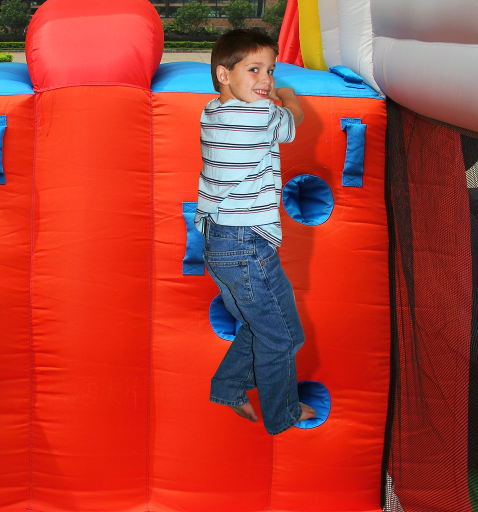 Na dvojitou skluzavku se děti vyšplhají po malé horolezecké stěně ze skákací plochy v zadní části atrakce.